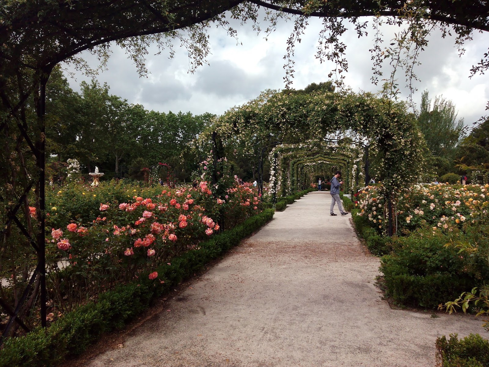 La rosaleda tiene en su perímetro un seto de casi 1,70 m de altura. Me imagino que servirá para proteger los rosales del frío invierno madrileño y también para separarla del resto del parque, a veces, demasiado concurrido. Esto hace que, hasta que no entras en el recinto, no te das cuenta de dónde estás realmente. Primero por la vista de esta cantidad de rosales en flor, segundo, por la fragancia que te golpea nada más cruzar la puerta. Absolutamente maravillosa.